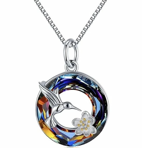 Mooie ketting met een Kolibrie op een kleurrijke ring.