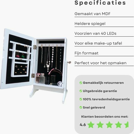 Het sieradenkastje is voorzien van led verlichting op batterijen. Er is geen stopcontact voor nodig. Het voordeel daarvan is dat je het kastje overal neer kunt zetten.