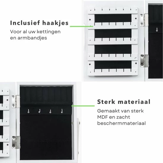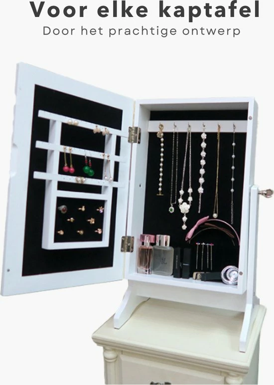 Ben je op zoek naar een handige opbergplek voor je sieraden? Dan is het sieradenkastje van Cheqo Γ©cht iets voor jou. In dit kastje bewaar jij jouw mooiste sieraden netjes, stofvrij en overzichtelijk bij elkaar. De verschillende vakjes en haakjes helpen bij het sorteren van ringen, oorbellen, kettingen, armbandjes en al je andere sieraden.