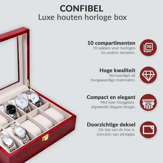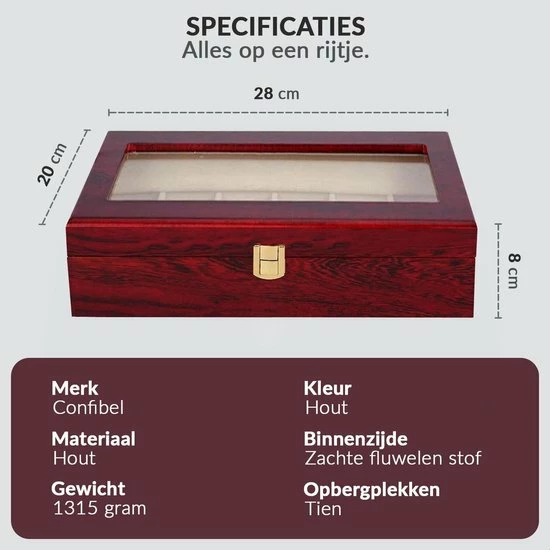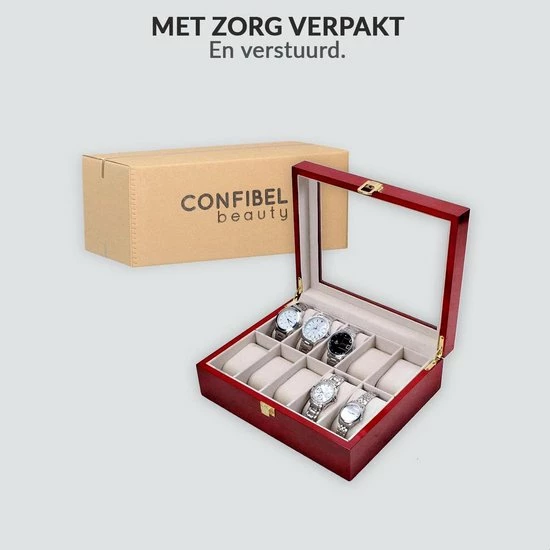 Horlogebox kopen? Iedereen die een horloge in bezit heeft kan eigenlijk niet zonder de mooie horloge opbergdoos van Confibel. Een horloge is een duurzaam product die zowel een hoog financieel als emotioneel waarde kan hebben. De minimalistische horlogebox van Confibel is simpel maar puur. Laat je niet beperken door de naam, want ook sieraden passen prima in deze horlogebox. Voornamelijk armbanden zullen goed ondersteund worden door de kussentjes. Bestel nu je horloge box en bescherm je waardevolle horloges en armbanden tegen schade en stof en ontvang de box de volgende werkdag in huis!