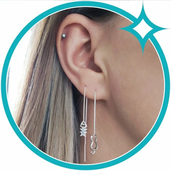 Deze superleuke doortrekoorbellen bestaan uit een kat, visgraat en een box ketting. De totale lengte is 87 mm. De hangers zijn 12 mm hoog. Ze zijn vervaardigd van 925 sterling zilver. Deze threaders zijn makkelijk en snel in te doen via het staafje aan het uiteinde van de box ketting. Duw het staafje door je oorgaatje en klaar!