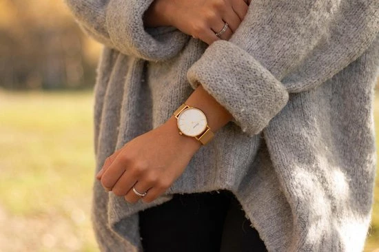 Deze horloge heeft een witte wijzerplaat in een gouden kast van 36 mm. Het ontwerp van dit uurwerk is elegant en minimalistisch.