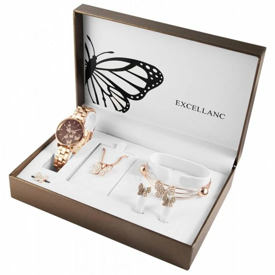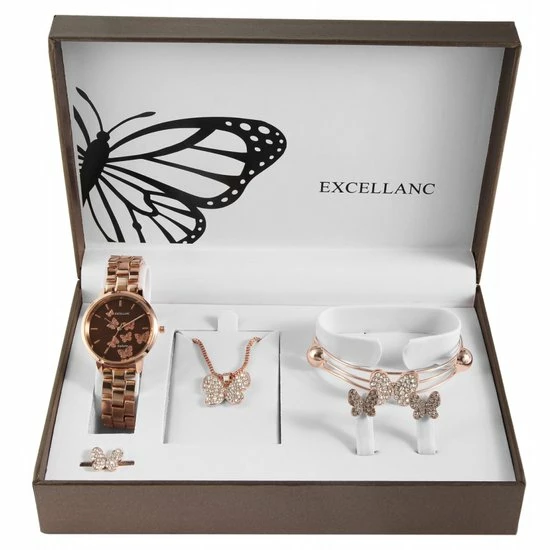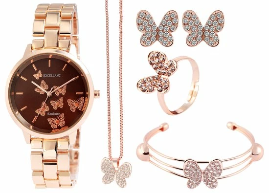 Elegante damesset, bestaande uit een horloge, halsketting met vlinder, 1 paar oorbellen , een ring en armband