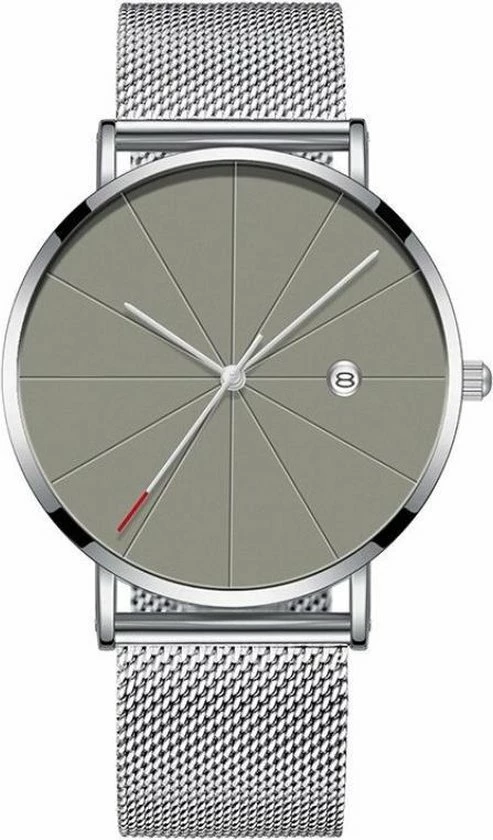 Een stijlvol horloge met een soepele zilverkleurige metalen mesh band en grijze wijzerplaat met gestreepte onderverdeling. Het horloge is voorzien van een subtiel rond dagvenster zodat u ook de juiste dag bij de hand heeft. Het horloge kan de hele dag door worden gedragen, heeft witte wijzers en is voorzien van een secondewijzer met rode punt. Een prettig dragend horloge voor een leuke prijs. De kast heeft een diameter van 40mm en het horloge heeft een lengte van 23cm.