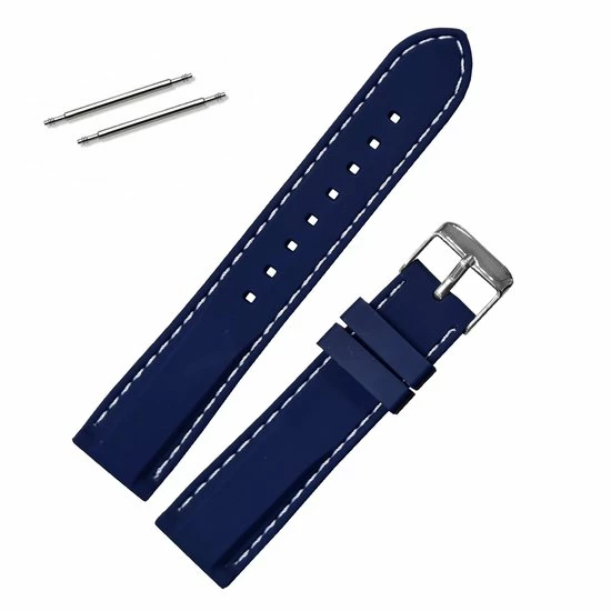 Een navy blauw horlogebandje gemaakt van siliconen in een luxe uitvoering. Het soepele A-kwaliteit bandje met verdikte bovenzijde heeft een stevige stalen gespsluiting en wordt geleverd inclusief universele pushpins. De rand van het bandje is gestikt met wit nylon waardoor het bandje een luxe uitstraling krijgt. Dit horlogebandje is geschikt voor de meeste horlogekasten en heeft een aanzetmaat van 20mm. Het bandje is ook geschikt voor Quick Release Pushpins.