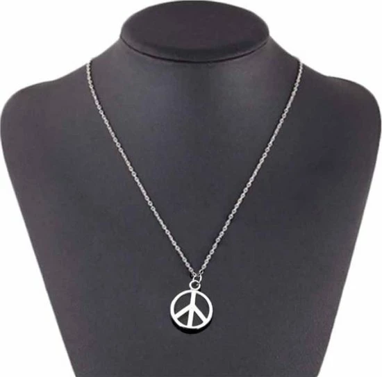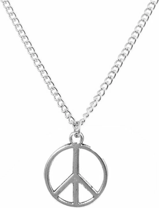 Een fijne zilverkleurige schakelketting met een hanger in de vorm van een peace teken. De doorsnede van het bedeltje is 12mm en de lengte van de ketting is ongeveer 45cm.
