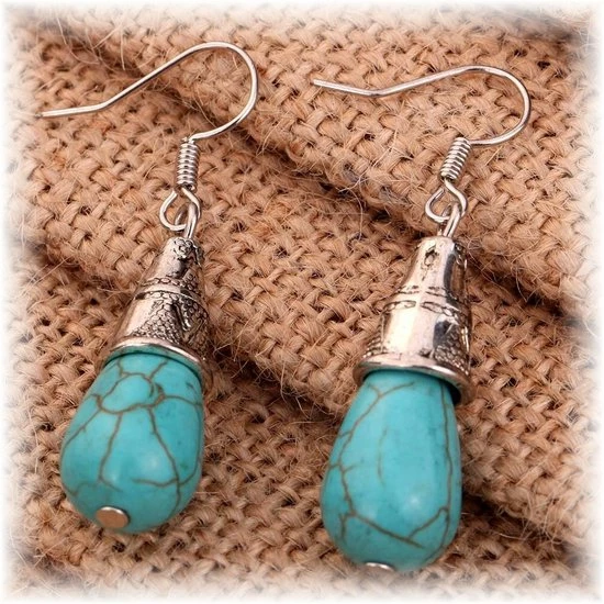 Vintage oorbellen voorzien van turquoise stenen. De oorbellen hebben de vorm een druppel die is verpakt in een zilverkleurig kokertje. Oorbellen met een eigentijds karakter die met veel kledingstijlen te combineren zijn. De oorbellen hebben een lengte van ongeveer 47mm en zijn 10mm breed.