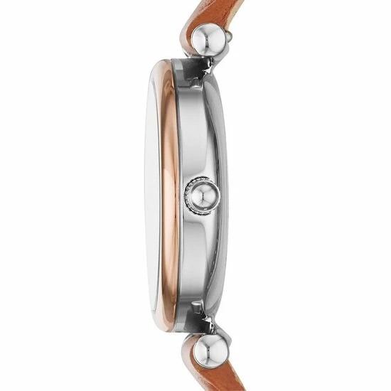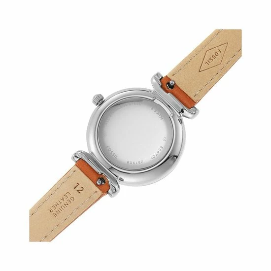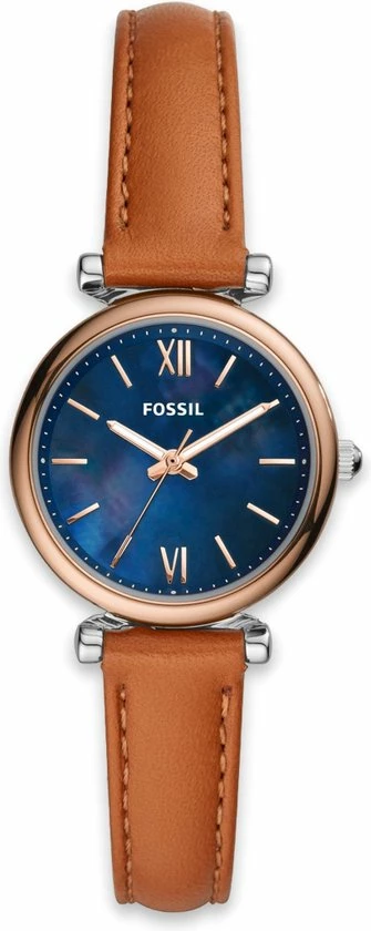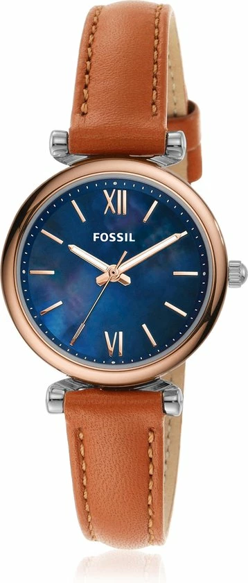 Deze Carlie Mini van 28 mm heeft een blauwe parelmoeren wijzerplaat met Romeinse cijfers en streepjes als uuraanduiding, een uurwerk met drie wijzers en een bruine leren band. Fossil