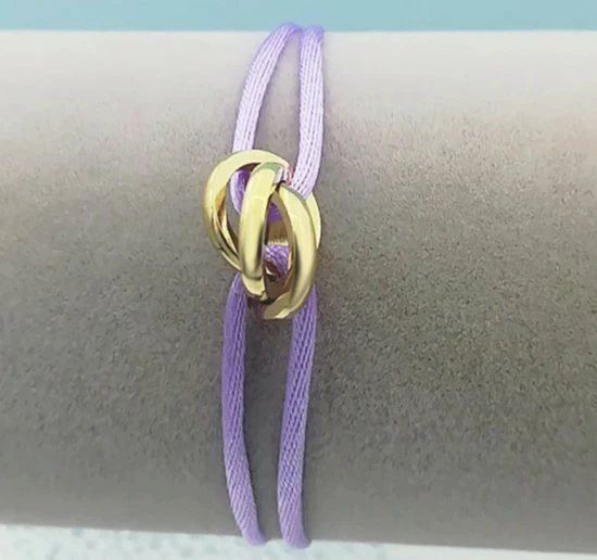 Prachtige bedel armband van Lieve Jewels! Aan een mooi satijnen koordje zijn 2 gouden ringetjes in elkaar gedraaid. Deze combinatie zorgt voor een verpletterend mooi effect. De armband straalt elegantie en klasse uit. Mooi om los te dragen Γ³f in combinatie met andere armcandy. De lengte is verstelbaar. Kleur koord: paars/lila.