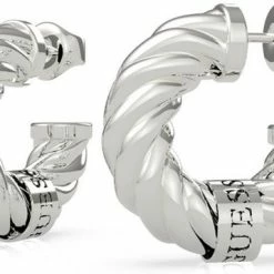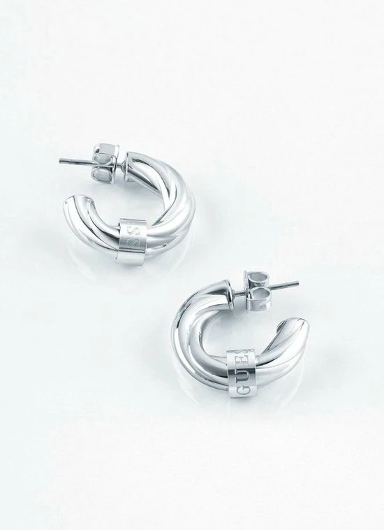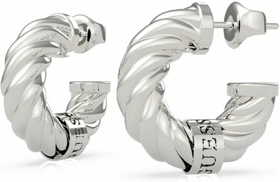 Straal met deze zilverkleurige twist Guess Jewellery oorringen. Het Guess logo is terug te zien op het shiny label van de oorring.De diameter is 20 mm. Model UBE70002.
