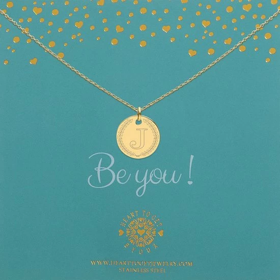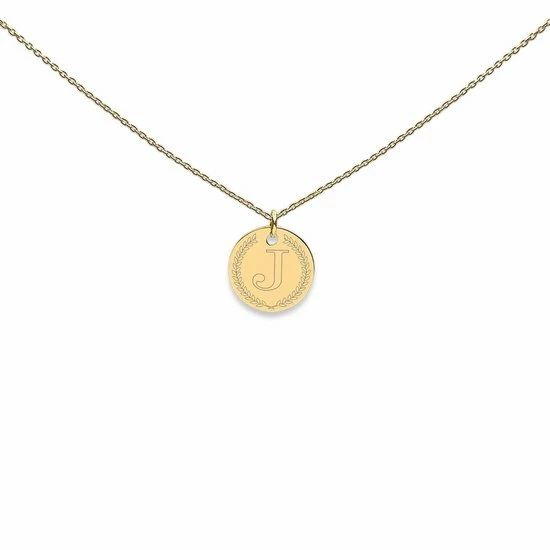 Goudkleurige ketting van stainless steel met 18 mm munt met gegraveerde letter J met krans, lengte max 45 cm