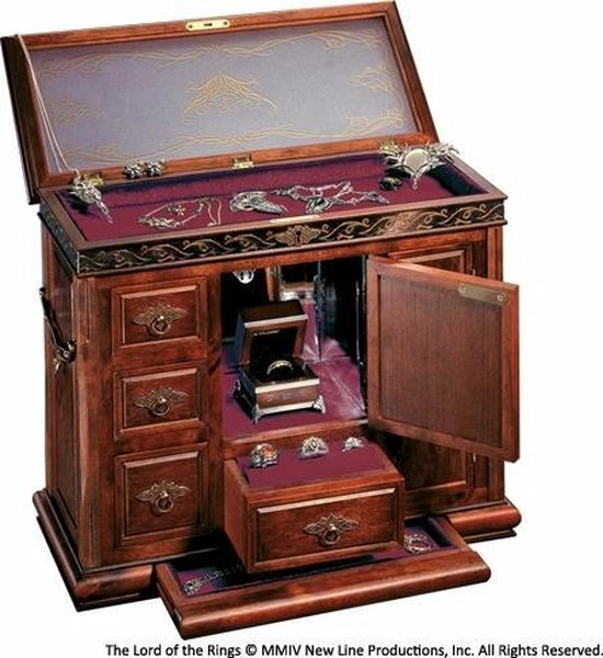 A beautiful jewelry chest inspired by all the beautiful designs of Middle-Earth to store and keep your most precious articles. Hardwood cabinet is set with many fine metal detailings. Measures approximately 55 cm in height. Jewelry not included.