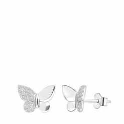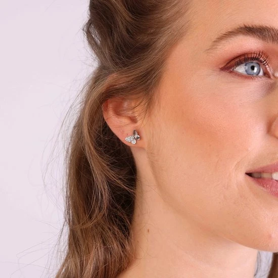 Prachtige oorknoppen in de vorm van een vlinder. De vleugels zijn aan de ene kant bezet met schitterende zirkonia steentjes en aan de andere kant opengewerkt. De oorknoppen zijn gemaakt van zilver met een rhodiumplating