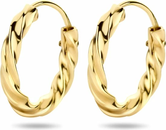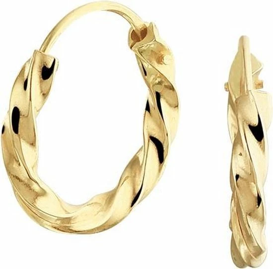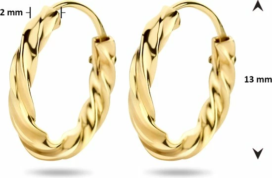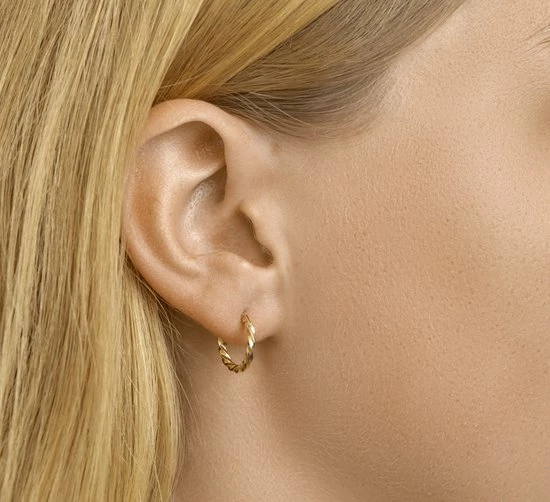 Klassieke geelgouden oorringen met een afmeting van 13x2mm uitgevoerd met een gedraaide buis. Door de eenvoud en het verfijnde ontwerp kunnen deze oorringen perfect worden gedragen met andere sieraden.