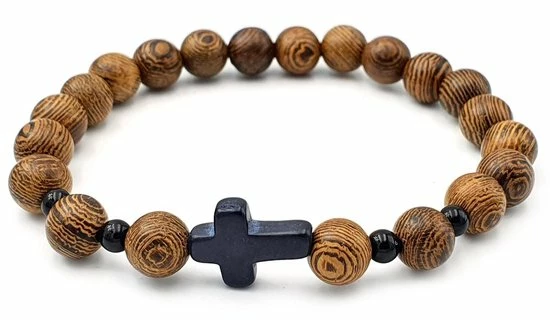 Elastische kralenarmband met 8mm houten kralen en zwarte stenen kraaltjes en kruisje.