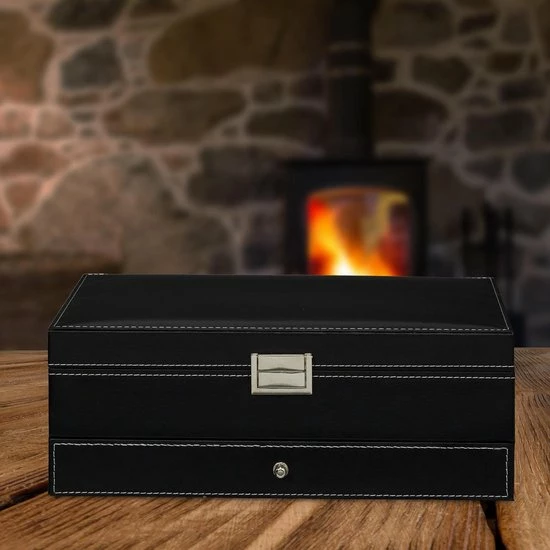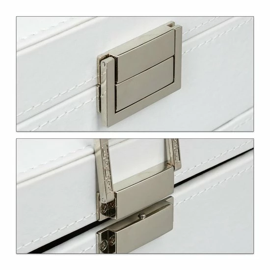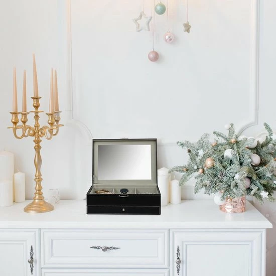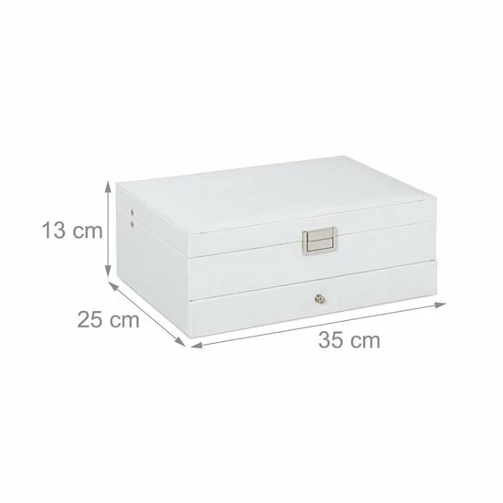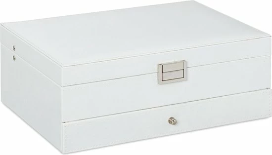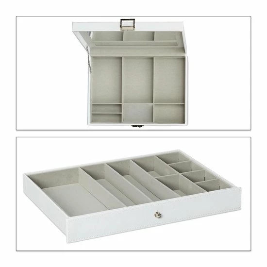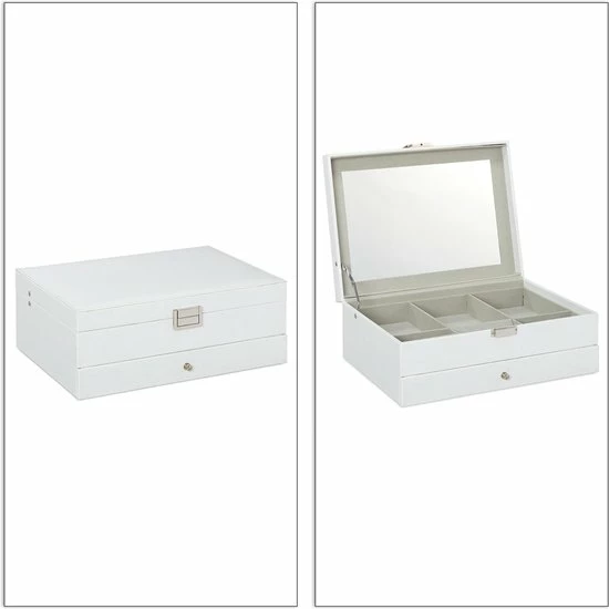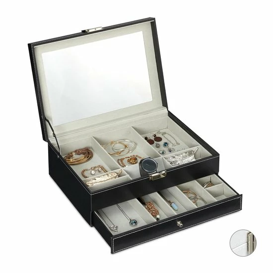 Kettingen uit de knoop halen of de tweede oorbel zoeken is iets, wat vrouwen kennen. Met deze sieradendoos kan je in de toekomst gemakkelijk en snel sieraden omdoen en heb je deze netjes en overzichtelijk opgeborgen. De grote spiegel in de deksel helpt je bij het uitzoeken van de juiste juwelen. Op twee etages heb je toegang tot vele verschillend grote vakken. Het kunstleer met afgezette naad is elegant en past in de woning van elke stijlvolle vrouw.