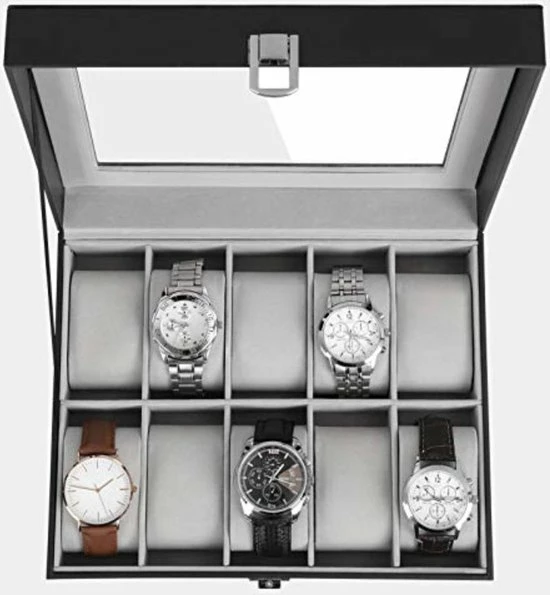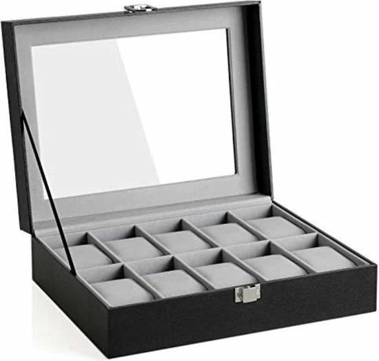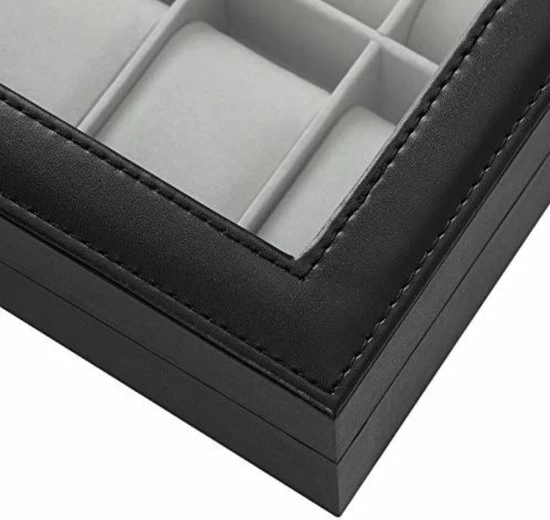 Met een transparant glazen deksel past de donkergrijze voering het beste bij het elegante zwarte kunstleer; metalen sluitingen schijnen helder; dit is een prachtig stuk om je horlogecollectie te organiseren en te tonen.