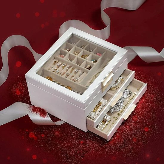 - VERBERG JE NIET! Ben je moe van het verstoppertje spelen met je juwelen? Dan kunt u deze juwelendoos proberen! Onder het glazen deksel kunt u uw favoriete sieraden in een duidelijk zichtbare positie plaatsen, zodat u uw ketting in één oogopslag kunt vinden.