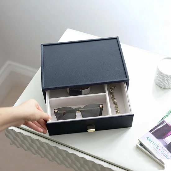 De diepe sieradendoos met 3 secties is perfect voor uw grotere stukken en accessoires. Den bijvoorbeeld aan zonnebrillen of haarklemmen.