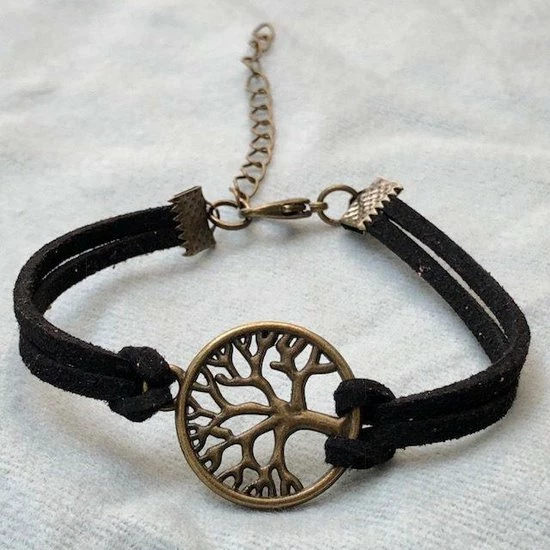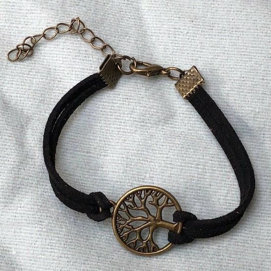 Prachtige Tree of Life armband gemaakt van zwart imitatie suรจde en met het kettinkje in te stellen van 17 – 22 cm lengte dus passend voor elke pols. Is eventueel ook als enkelbandje te gebruiken.