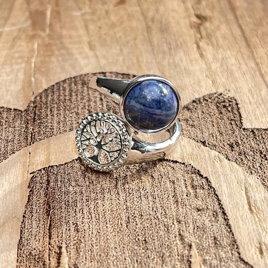Deze zeer stijlvolle zilverkleurige ring heeft een fraaie Lapis Lazuli steen gecombineerd met een Tree Of Life symbool. Deze ring is verstelbaar in maat en daardoor geschikt voor elke vinger.