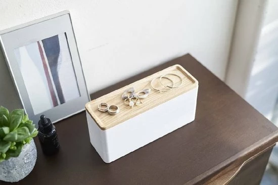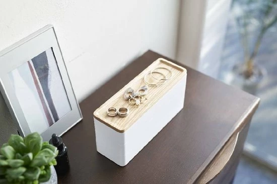 Yamazaki’s elegante accessory case heeft 3 handige bakjes met een afneembaar houten dienblad om je sieraden overzichtelijk en georganiseerd te houden. Binnenin is voldoende ruimte voor brillen, horologes en andere sieraden en deze blijven tevens goed beschermd dankzij de vilten beschermlaag in de bakjes. Op de houten bovenkant kun je dagelijkse sieraden kwijt zodat je deze snel bij de hand hebt maar toch georiganiseerd te houden.