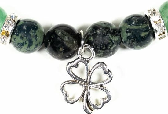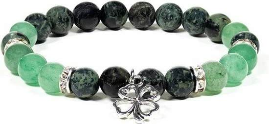 Elastische armband van kambaba jaspis en groene aventurijn, met klavertje vier bedel.